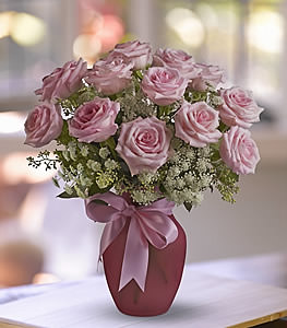Arrangement includes 12 pink roses and Queen Anne’s Lace accented with seeded eucalyptus. Delivered in a frosted pink vase tied with a pink satin ribbon.